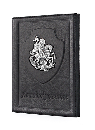 Обложка для автодокументов «Георгий Победоносец» выполнена вручную из телячьей кожи и украшена серебряной плакеткой.